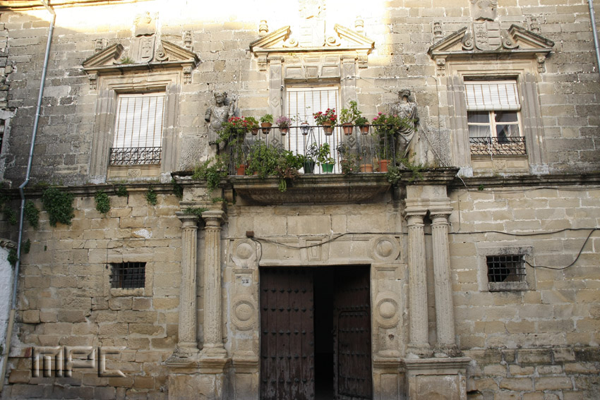 En el primer cuerpo encontramos la puerta de acceso con dobles columnas y espejos. En el segundo encontramos un balcón coronado por un frontón partido con un escudo y flanqueado por dos tenantes. La fachada se retranquea respecto a la alineación del resto de edificaciones para generar un pequeño espacio delantero y realzar la construcción.