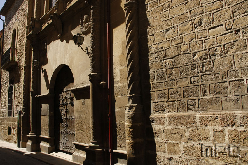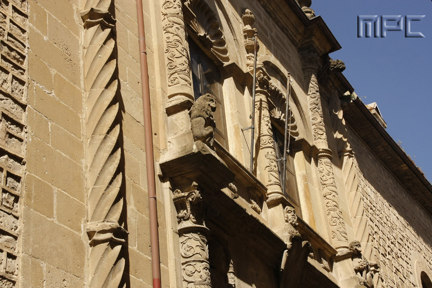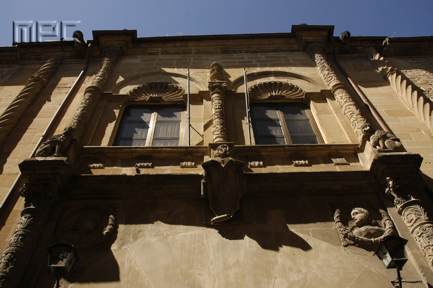 Sobre el arco se representa la figura de un salvaje barbado, elemento muy común en las portadas de la ciudad, y dos medallones con las representaciones de la caridad y la virtud. Actualmente alberga la residencia para la tercera edad.