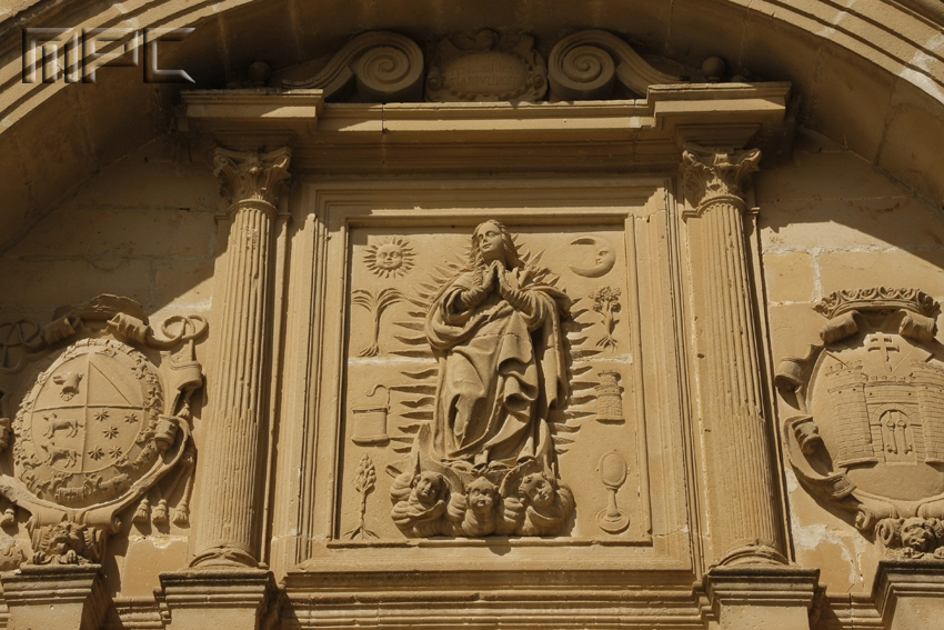 La portada pertenece a la ampliación de 1625 por parte del Obispo Moscoso. Se trata de una portada de arco de medio punto, flanqueada por dos pilastras, todo este conjunto se encuentra dentro de otro arco de medio punto que a su vez también está flanqueado por otras dos pilastras. Tambien hay un relieve de la Inmaculada rodeada por los símbolos de la letanía.