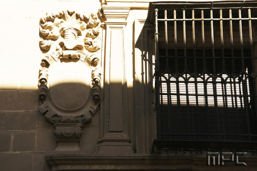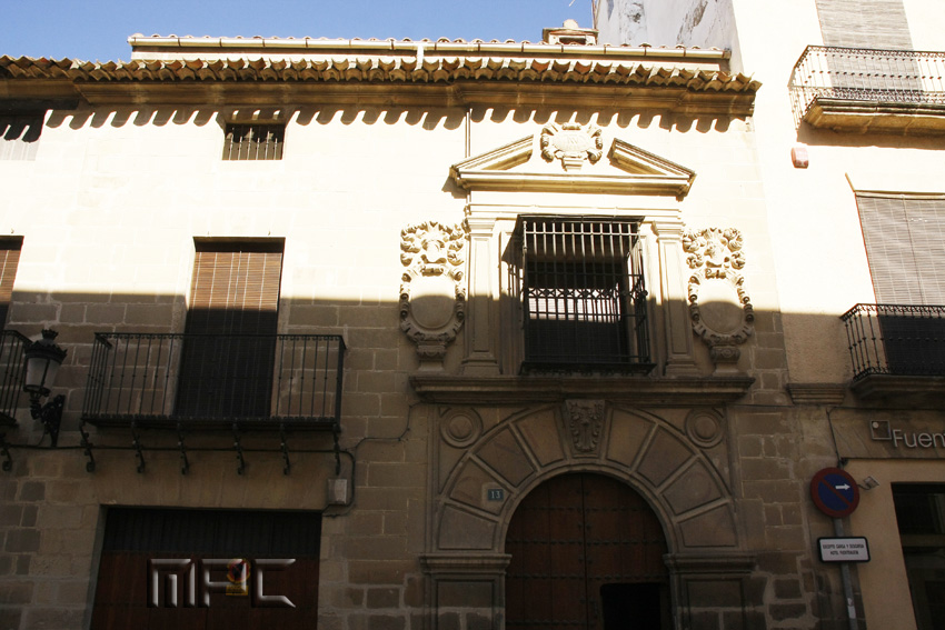 En el interior tiene un patio con columnas de capitel dórico y zapatas de madera, con una fuente barroca en el centro. El arranque de la escalera se hace a través de columnas y arcos, cubriéndose el espacio con una cúpula.